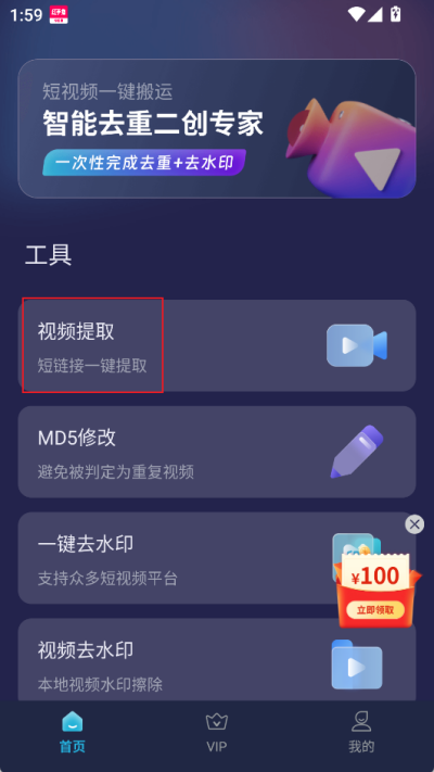 1、首先打開下載好的短視頻一鍵搬運app,進入軟件后點擊界面上的【視頻提取】功能;