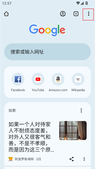 1、首先打開下載好的谷歌瀏覽器app,進(jìn)入軟件后點(diǎn)擊右上角的三個點(diǎn);