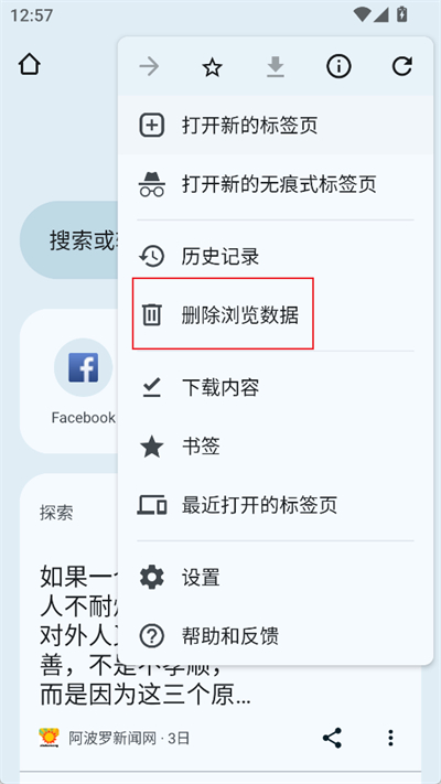 2、點(diǎn)擊后會彈出更多的功能選項(xiàng),找到里面的【刪除瀏覽數(shù)據(jù)】選項(xiàng)點(diǎn)擊;
