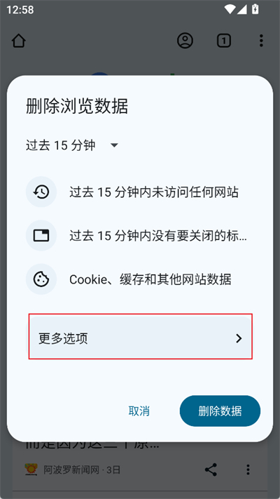3、點(diǎn)擊后彈出刪除瀏覽數(shù)據(jù)界面,我們點(diǎn)擊【更多選項(xiàng)】查看;