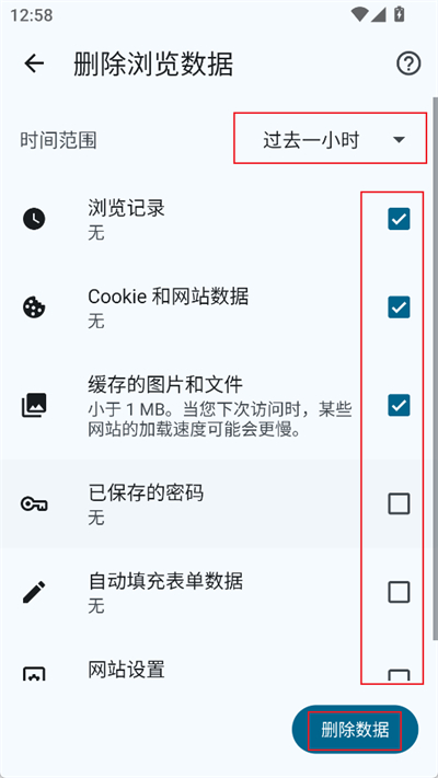 4、進(jìn)入更多選項(xiàng)界面后,在這里可以選擇刪除數(shù)據(jù)的時間范圍以及相應(yīng)數(shù)據(jù),選擇完畢后點(diǎn)擊下方的【刪除數(shù)據(jù)】選項(xiàng)即可清理緩存。