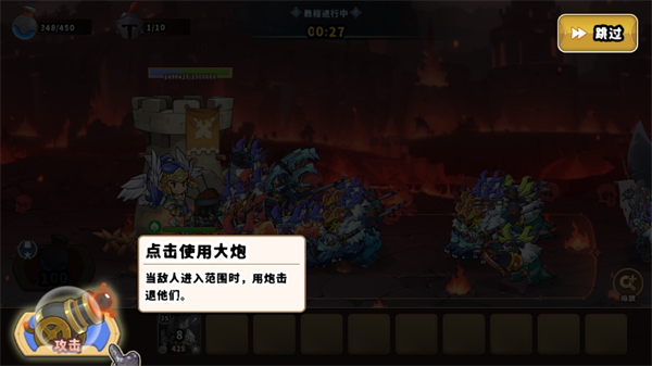 3、隨著時(shí)間的推進(jìn),左側(cè)的大炮冷卻時(shí)間也到了,點(diǎn)擊使用大炮可以對(duì)范圍內(nèi)的敵人造成大量傷害,一次性將他們擊??;