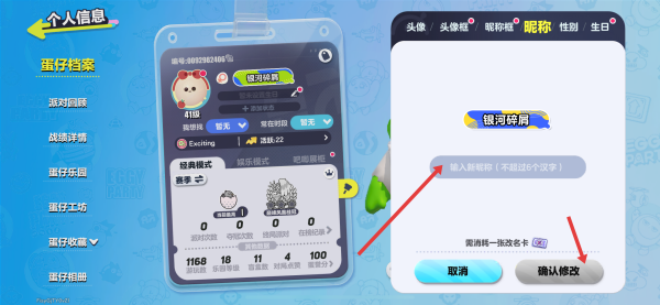 3、在昵稱修改界面,刪除原有的昵稱,輸入你想要更換的新昵稱 ,點(diǎn)擊確認(rèn)按鈕,消耗相應(yīng)的改名卡,即可完成昵稱更換。