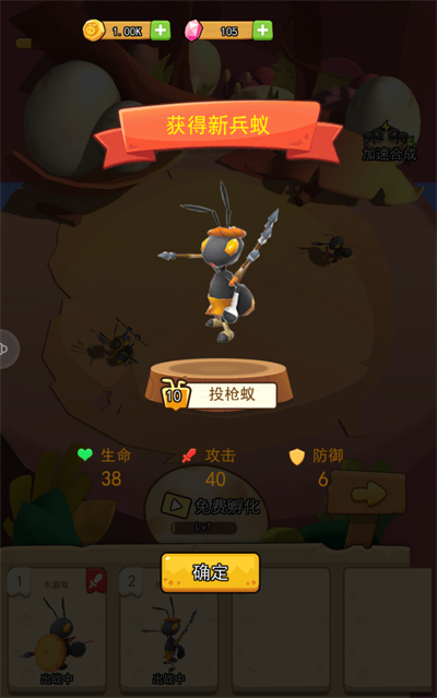 3、點(diǎn)擊后即可孵化出全新的兵蟻,新的兵蟻會(huì)有全新的技能和屬性,玩家在關(guān)卡中選擇召喚新的兵蟻了。