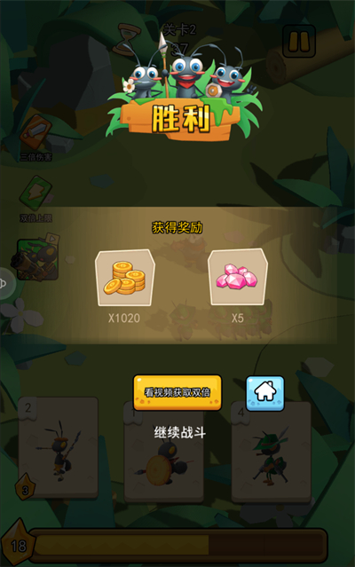 3、依靠諸多強(qiáng)大的兵蟻將敵人消滅后即可成功獲得勝利,解鎖獲得海量金幣和鉆石獎勵,使用金幣孵化出更多的兵蟻。