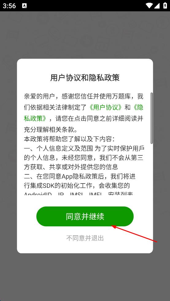 1、打開萬題庫,出現(xiàn)用戶協(xié)議和隱私政策提示框,點擊同意并繼續(xù)。
