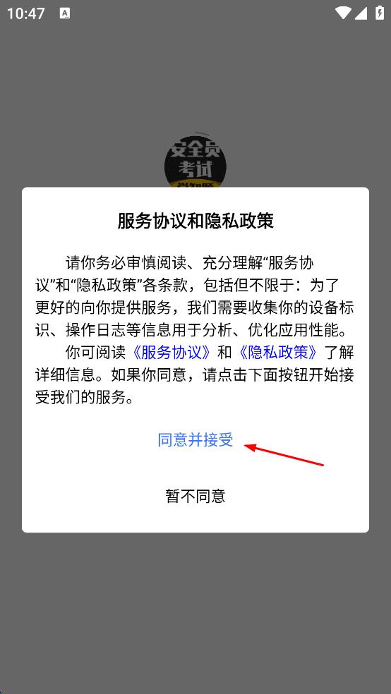 1、打開安全考試APP,彈出“服務協(xié)議和隱私政策”窗口,仔細閱讀相關內(nèi)容后,點擊“同意并接受”按鈕,進入登錄頁面。