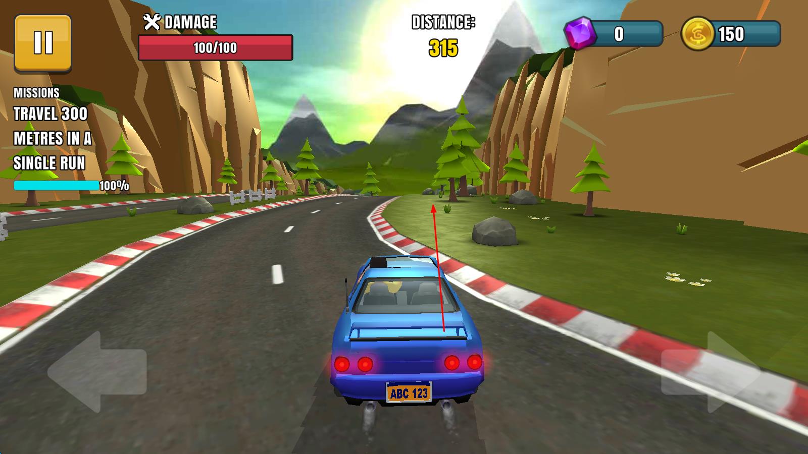 2、操控藍(lán)色賽車(chē)在彎道道路行駛,注意躲避障礙,依據(jù)畫(huà)面提示,朝著目標(biāo)距離前進(jìn) 。