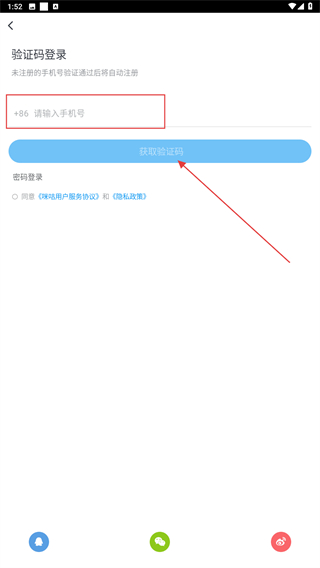 3、在驗(yàn)證碼登錄的頁(yè)面內(nèi),輸入手機(jī)號(hào)后點(diǎn)擊獲取驗(yàn)證碼。