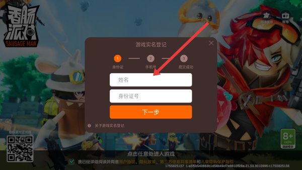 1、在香腸派對(duì)實(shí)名認(rèn)證環(huán)節(jié),第一步需準(zhǔn)確填寫姓名與身份證號(hào),確認(rèn)信息無(wú)誤后點(diǎn)擊下一步按鈕,推進(jìn)認(rèn)證流程。