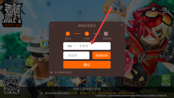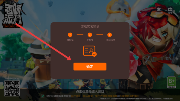 3、完成手機(jī)號(hào)驗(yàn)證后,界面顯示認(rèn)證進(jìn)度完成,點(diǎn)擊橙色確定按鈕,即可完成香腸派對(duì)的實(shí)名認(rèn)證登記。