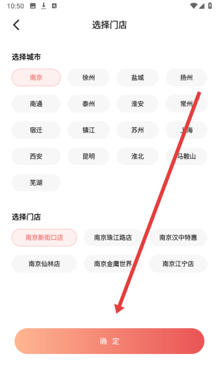 4、在選擇門(mén)店頁(yè)面中,確定好城市門(mén)店后點(diǎn)擊確定按鈕完成注冊(cè)操作。