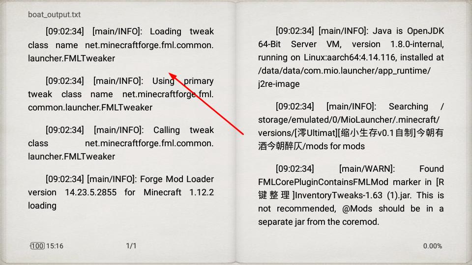 3、打開boat_output.txt日志文件,查看Minecraft游戲啟動階段的Forge模組加載、Java環(huán)境等運行信息,了解系統(tǒng)啟動狀態(tài)。