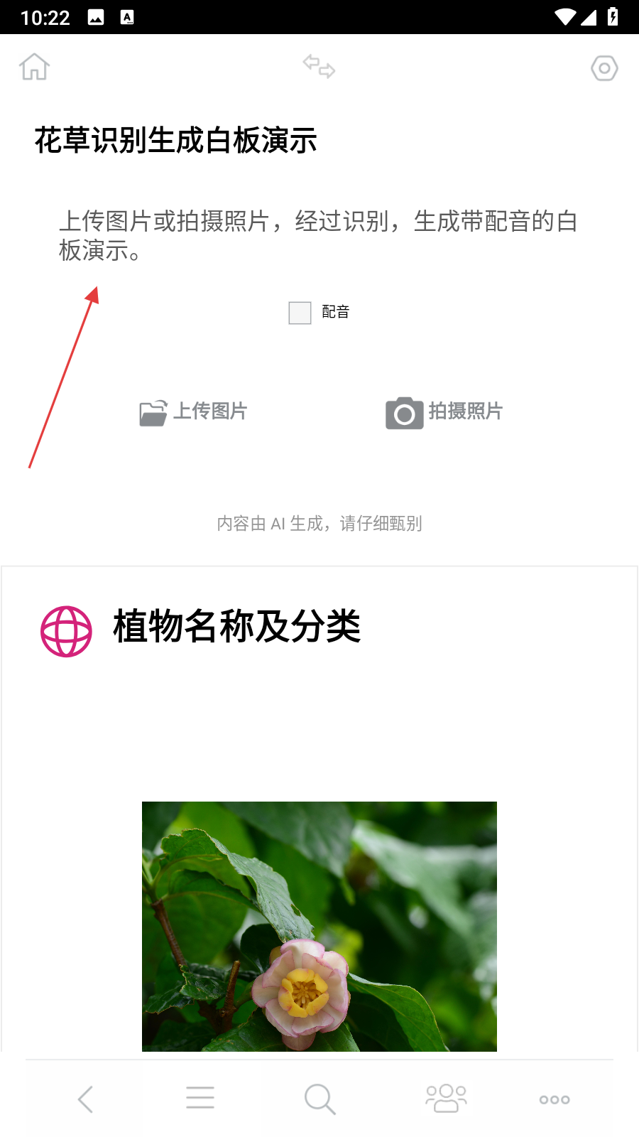 4、在花草識別生成白板演示界面,通過上傳圖片或拍攝照片上傳花草圖片,經(jīng)識別后,可生成帶配音的白板演示內(nèi)容。