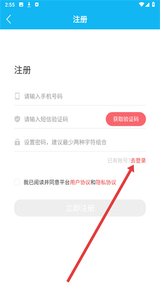 3、注冊(cè)頁面點(diǎn)擊“去登錄”,切換至賬號(hào)密碼登錄界面。