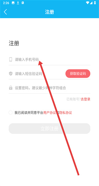 3、在進(jìn)入到注冊(cè)頁面后,可以點(diǎn)擊輸入框填寫注冊(cè)的手機(jī)號(hào),以便獲取驗(yàn)證碼進(jìn)行注冊(cè)。