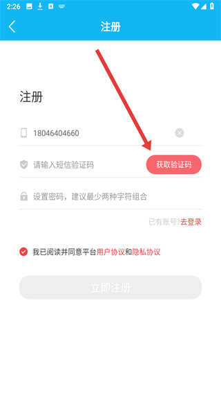 4、在填寫好手機(jī)號(hào)后,點(diǎn)擊獲取驗(yàn)證碼按鈕進(jìn)行填寫,在填寫完后續(xù)注冊(cè)信息后,即可完成注冊(cè)操作。