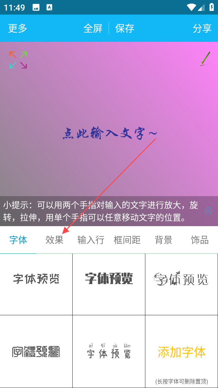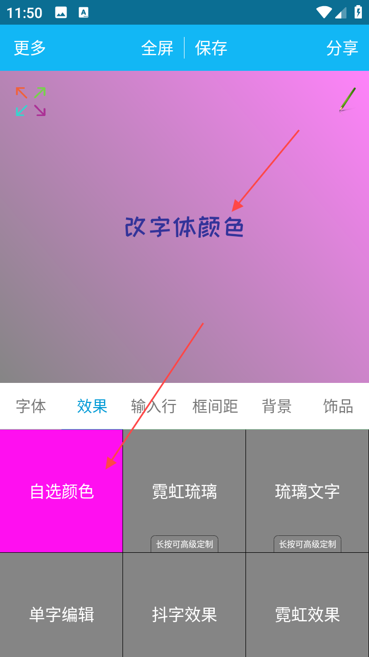 字體美化秀提供了多種濾鏡一鍵設(shè)置,文字水印效果一點(diǎn)所見即所得,長按可自由定制個(gè)性化的文字效果。