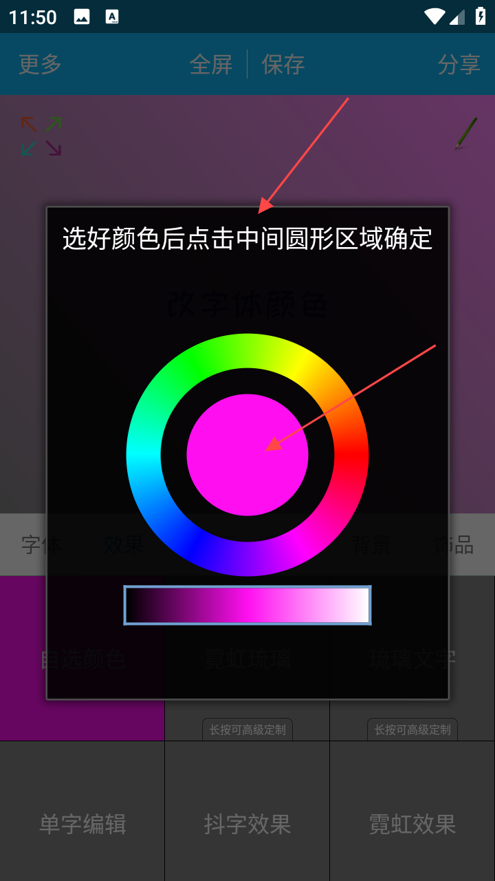 3、點(diǎn)擊改字體顏色后,會(huì)彈出顏色選擇界面,在顏色圓環(huán)或色板上選擇想要的顏色,選好顏色后點(diǎn)擊中間圓形區(qū)域確定,即可將字體改為所選顏色。