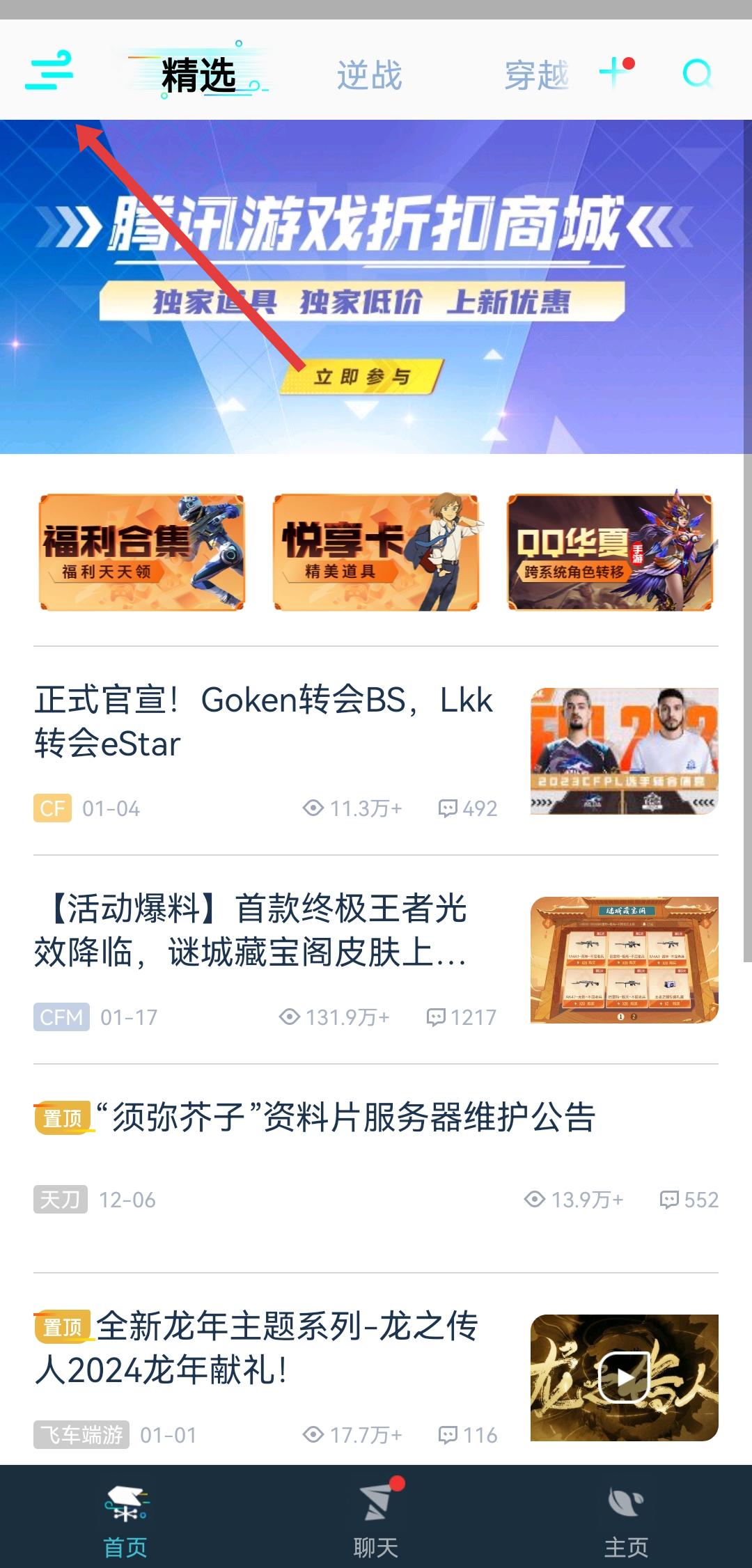 1、在騰訊游戲助手首頁左上角,點(diǎn)擊三橫線形狀的菜單按鈕,打開側(cè)邊欄。