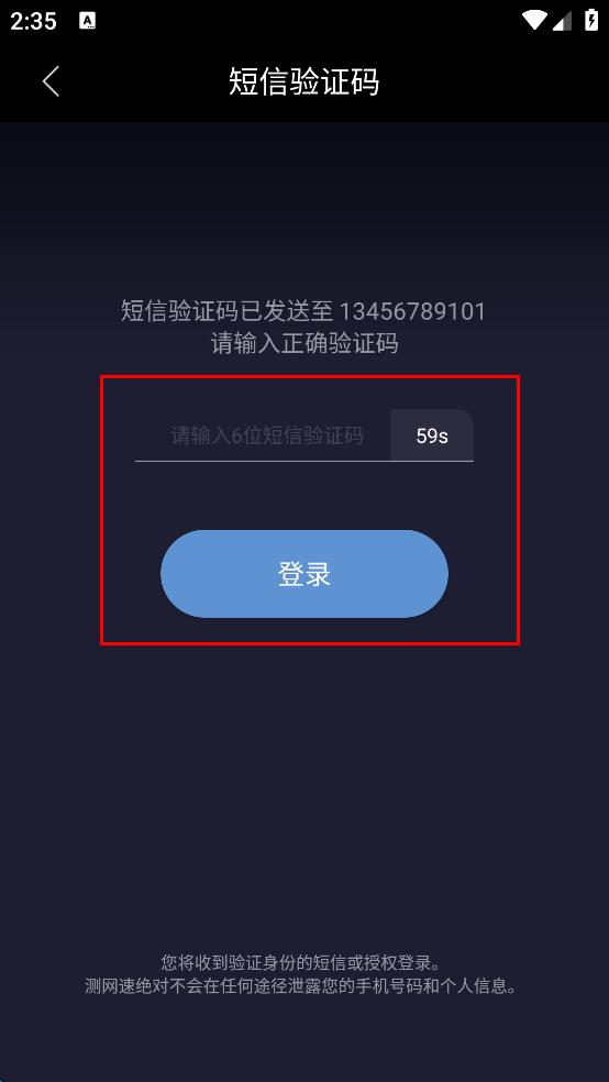 4、輸入收到的6位短信驗證碼,點擊登錄,完成登錄后即可使用軟件的測速等功能。