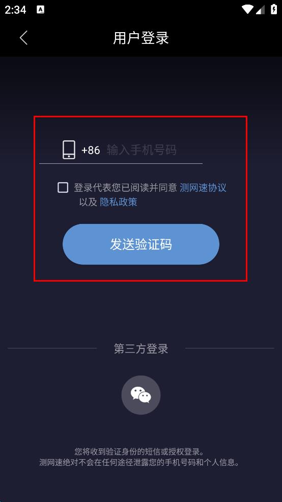 3、在用戶登錄界面輸入手機號碼,勾選同意測網(wǎng)速協(xié)議和隱私政策,點擊發(fā)送驗證碼。