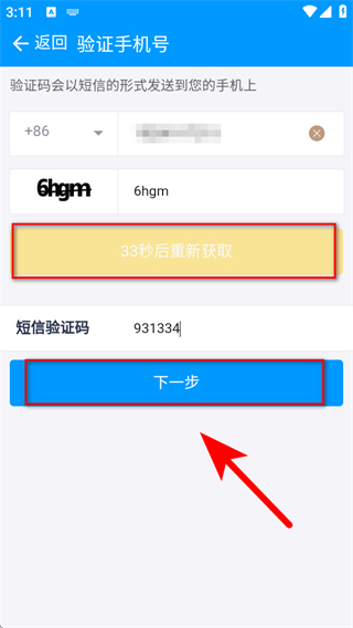 3、在驗(yàn)證手機(jī)號的頁面,輸入收到的短信驗(yàn)證碼,點(diǎn)擊下一步。