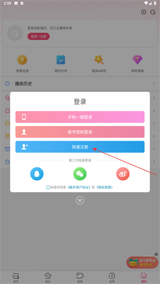 3、當頁面彈出登錄的方式,點擊快速注冊的功能按鈕。