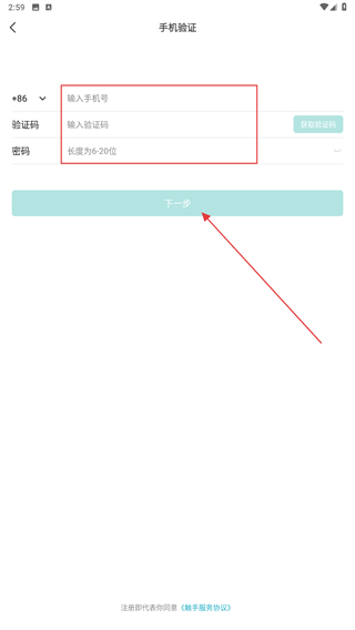 4、輸入手機號、驗證碼以及密碼后,點擊下一步即可注冊成功。