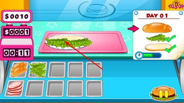 1、進(jìn)入烹飪?nèi)髦斡螒蚝?,先查看首位顧客的口味需求,從食材庫中挑選對應(yīng)面包、肉類與蔬菜,通過點(diǎn)擊拖拽完成基礎(chǔ)食材搭配,熟悉制作流程。