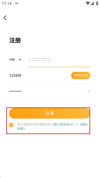 3、勾選同意用戶服務(wù)協(xié)議與隱私政策,點擊“注冊”按鈕。