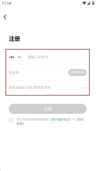 2、在注冊界面輸入手機號,獲取并填寫驗證碼,設(shè)置密碼。
