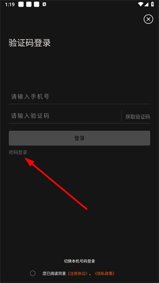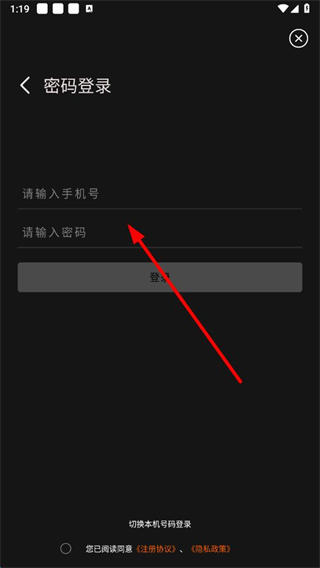 3、在密碼登錄頁面,輸入手機(jī)號(hào)和密碼,勾選同意協(xié)議后,點(diǎn)擊登錄即可完成密碼登錄操作。