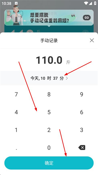 2、在手動(dòng)記錄頁(yè)面,輸入新的體重?cái)?shù)值,選擇記錄時(shí)間后,點(diǎn)擊確定。