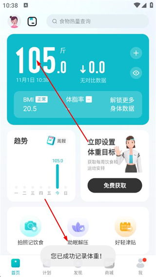 3、操作完成后,首頁(yè)體重?cái)?shù)據(jù)將更新為修改后的數(shù)值,提示您已成功記錄體重。