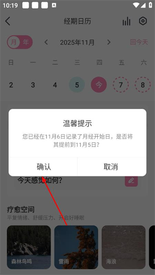 3、在溫馨提示彈窗中點(diǎn)擊確認(rèn),即可將經(jīng)期開(kāi)始日提前,完成經(jīng)期時(shí)間修改。