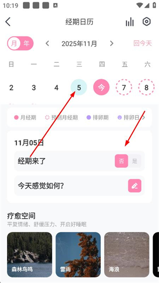 2、在經(jīng)期日歷頁(yè)面選擇要修改的日期,點(diǎn)擊是確認(rèn)經(jīng)期來(lái)了。