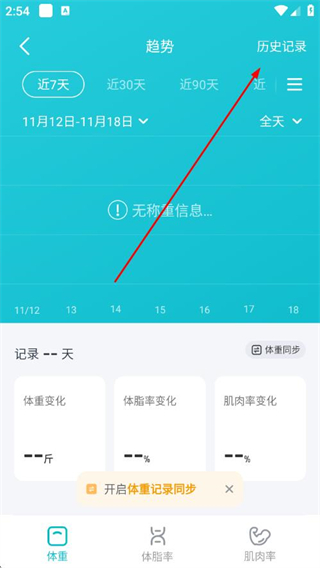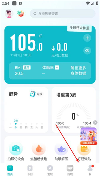 2、在個(gè)人頁(yè)面點(diǎn)擊體重記錄/天選項(xiàng),進(jìn)入趨勢(shì)頁(yè)面。