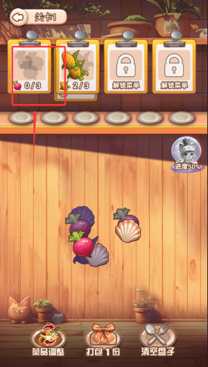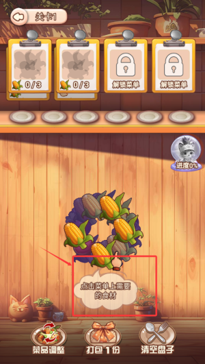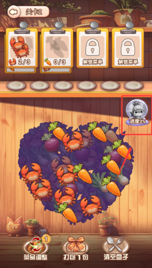 2、融入經(jīng)典消除機制,通過點選菜單欄中的同類食材完成匹配消除。