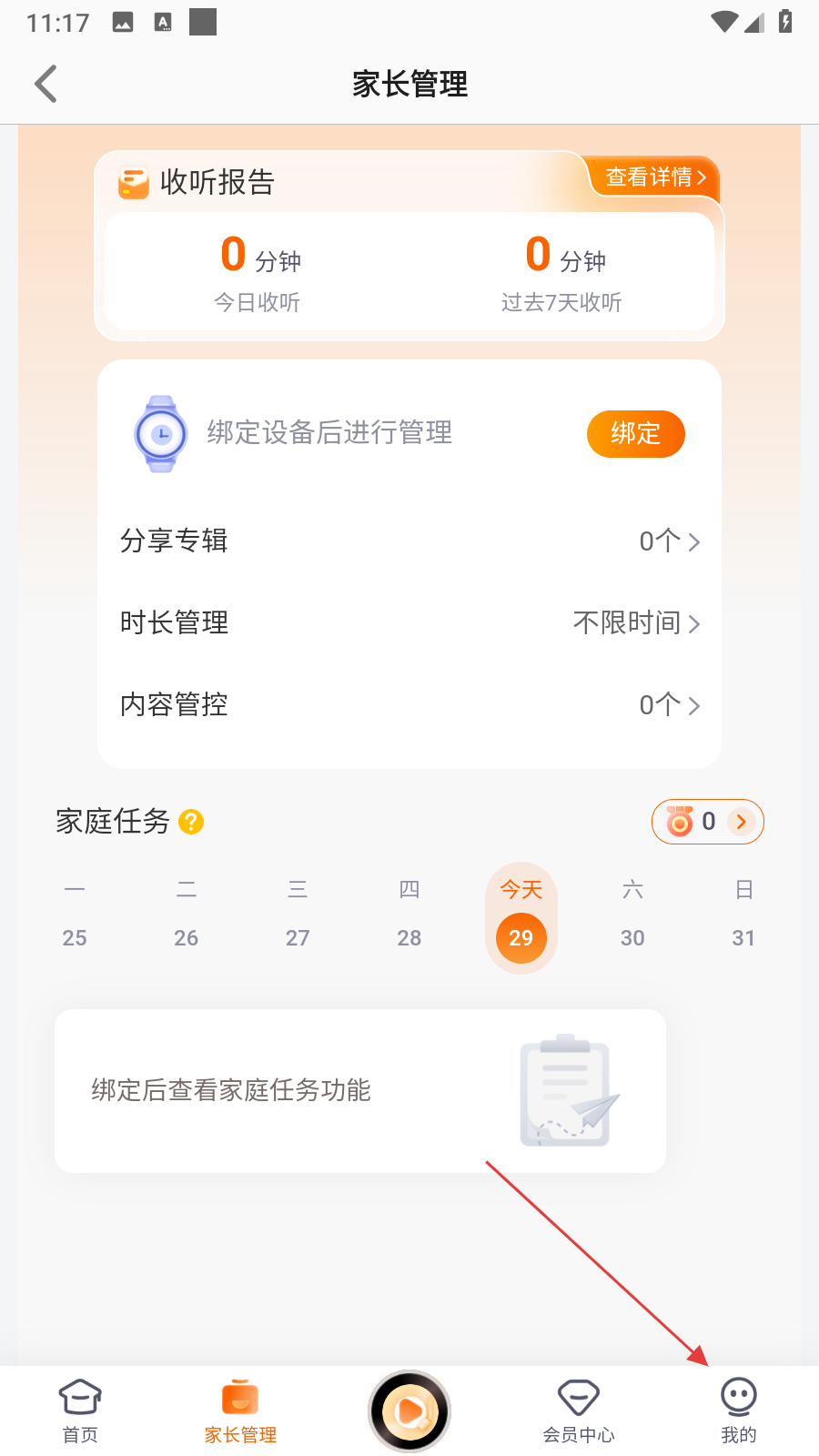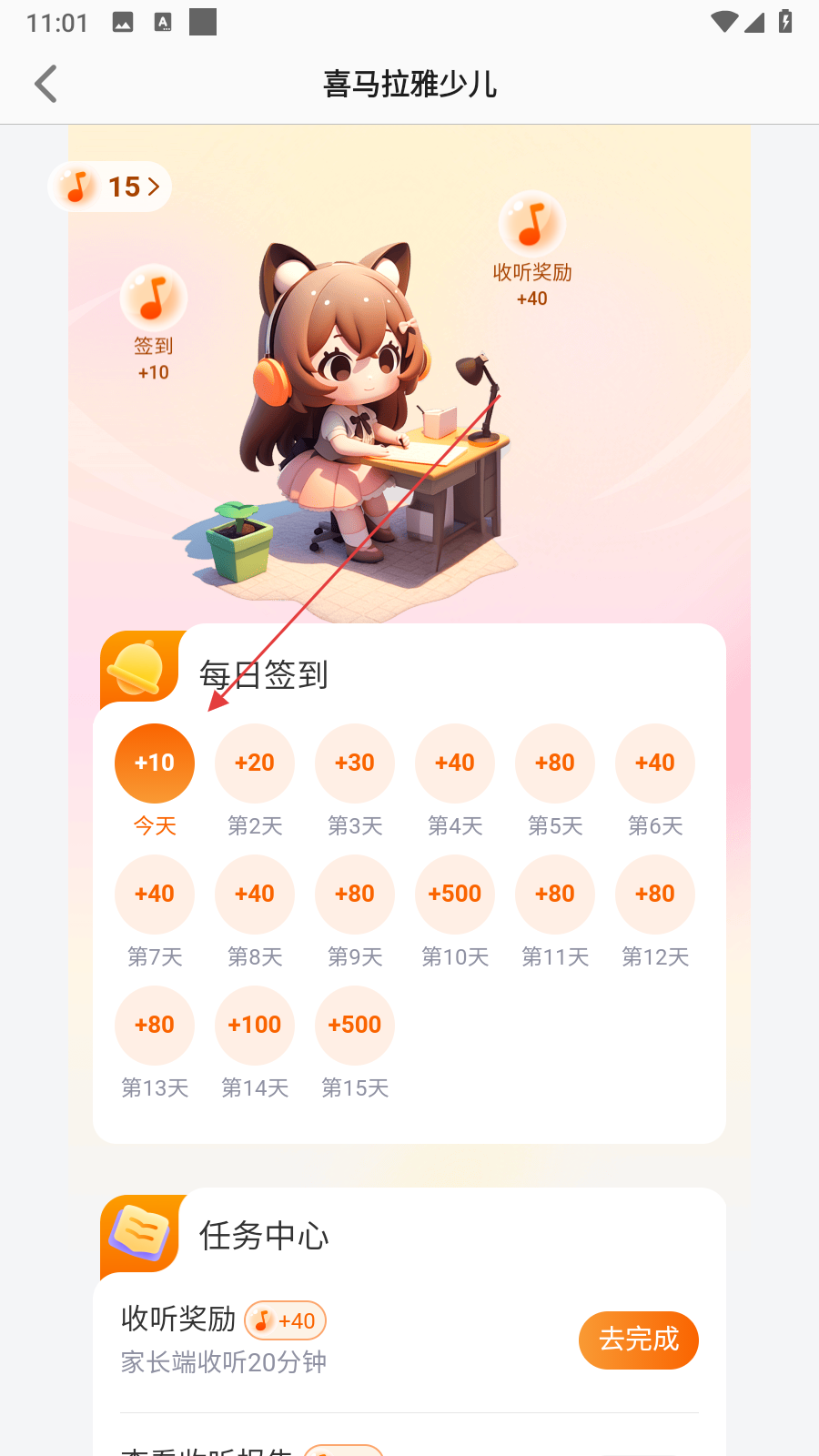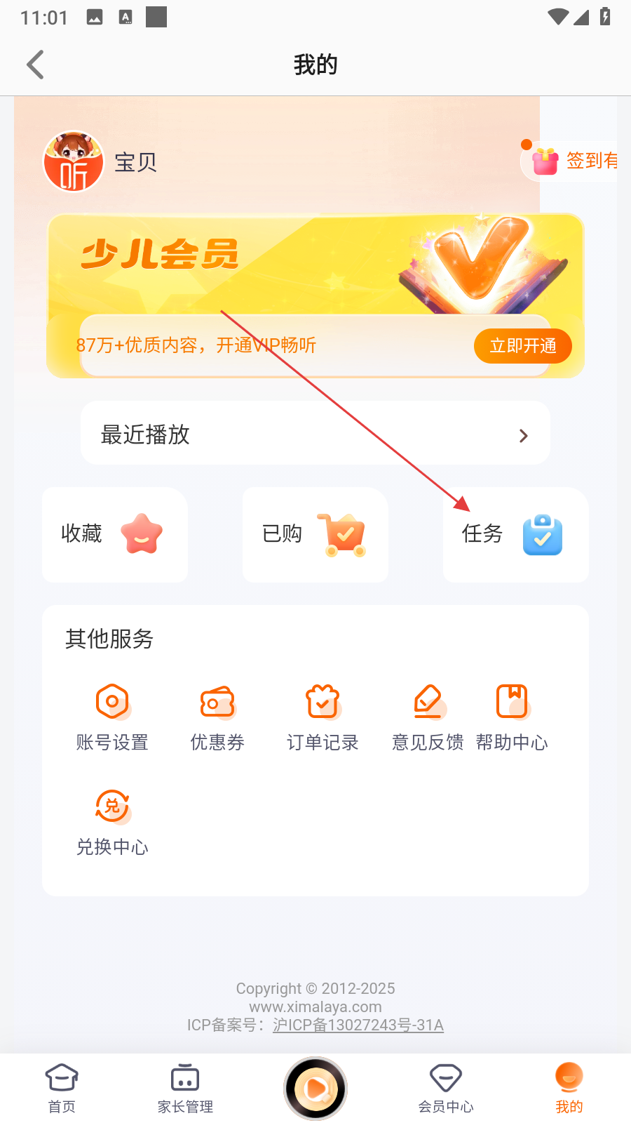 2、在個人中心頁面,定位到任務圖標,點擊進入喜馬拉雅少兒的任務界面,可看到簽到、收聽獎勵等任務板塊。