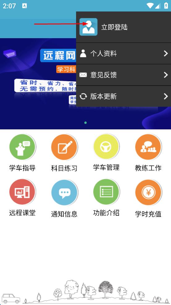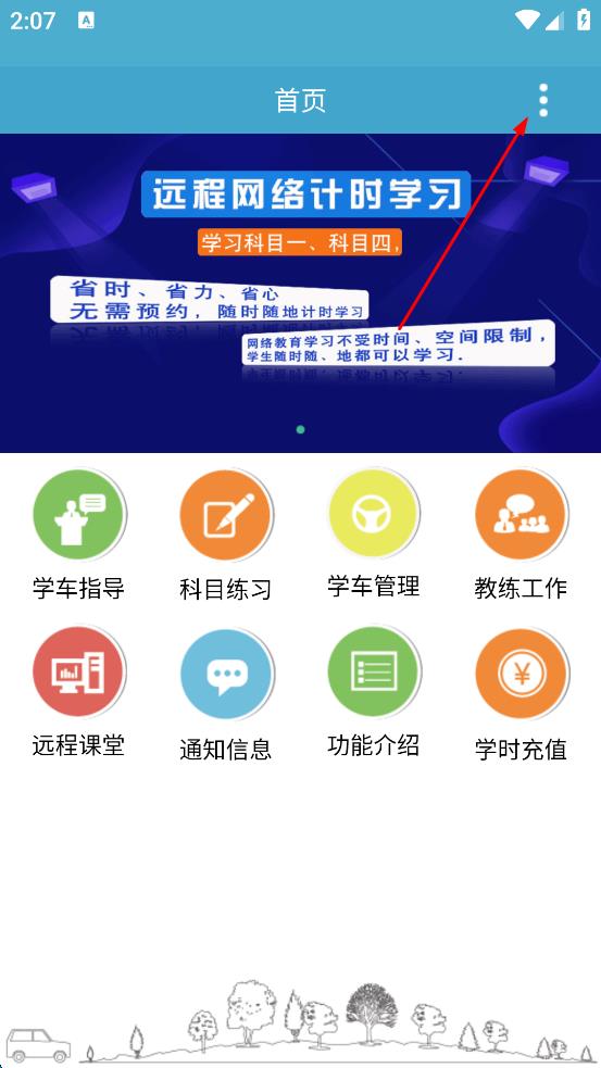 1、打開駕考學習軟件,進入首頁,看到有學車指導、科目練習等功能圖標,點擊頁面右上角的三點圖標,彈出操作選項。