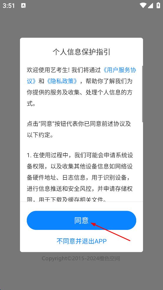 1、打開(kāi)藝考生APP,會(huì)彈出個(gè)人信息保護(hù)指引窗口,閱讀后點(diǎn)擊“同意”按鈕,進(jìn)入APP主界面。