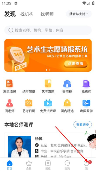 1、打開(kāi)藝考生,點(diǎn)擊底部導(dǎo)航欄的我選項(xiàng)。