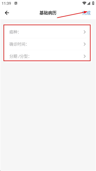 3、在基礎(chǔ)病歷頁(yè)面選擇癌種、確診時(shí)間、分期/分型,點(diǎn)擊完成。