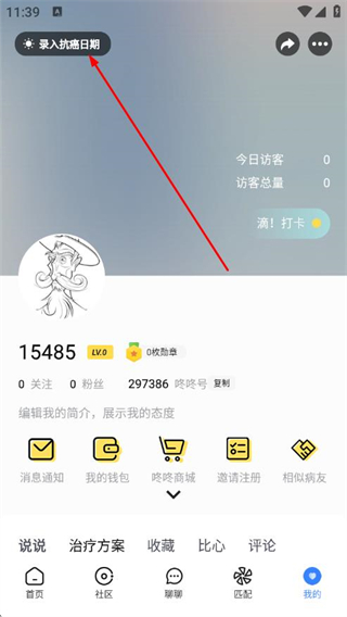 2、在我的頁(yè)面點(diǎn)擊錄入抗癌日期,進(jìn)入基礎(chǔ)病歷頁(yè)面。