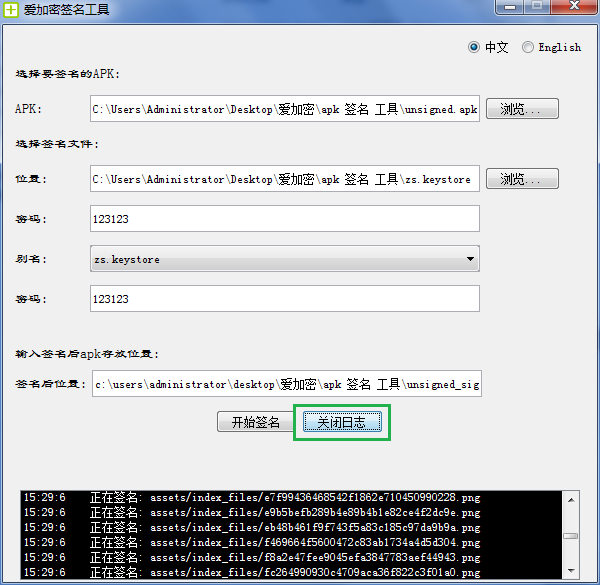 7.開始簽名(在點擊工具“開始簽名”后工具開始對apk進行簽名操作)