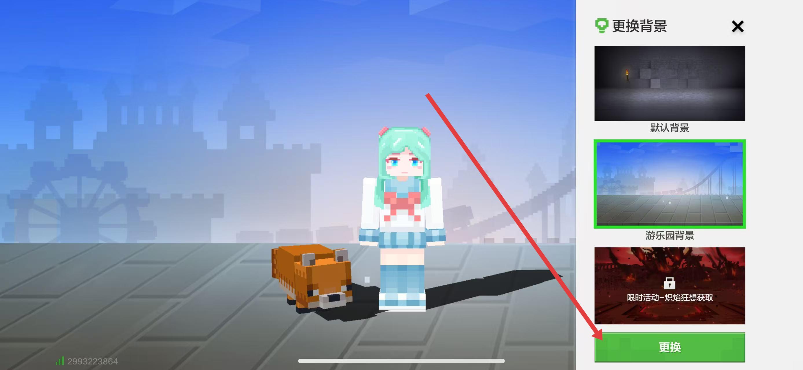 3、選定背景如游樂(lè)園背景后,點(diǎn)擊下方綠色更換按鈕,即可應(yīng)用新背景,更新主界面顯示。
