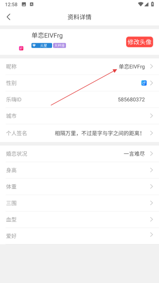 3、在資料詳情頁(yè)面中,找到昵稱選項(xiàng),點(diǎn)擊進(jìn)入昵稱編輯頁(yè)面。