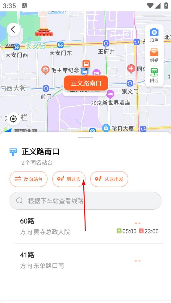 3、進(jìn)入站點(diǎn)詳情地圖頁,能看到站點(diǎn)位置及途經(jīng)公交,根據(jù)需求點(diǎn)擊“到這去”“從這出發(fā)”等按鈕,規(guī)劃前往或離開該站點(diǎn)的出行路線。