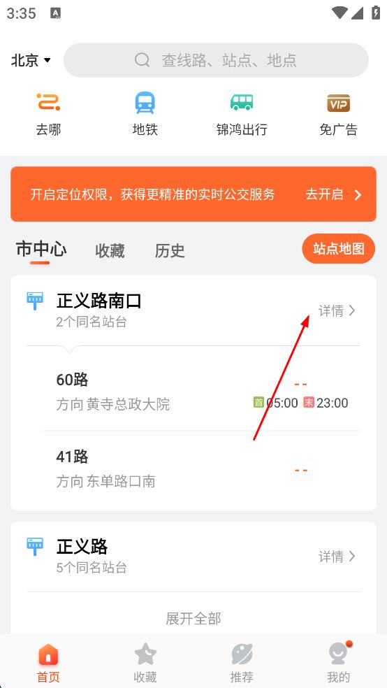 2、選定城市后進(jìn)入主界面,在“市中心”等分類下找到目標(biāo)站點(diǎn)如“正義路南口”,點(diǎn)擊站點(diǎn)右側(cè)“詳情”,查看站點(diǎn)更詳細(xì)信息及途經(jīng)公交線路。